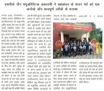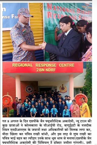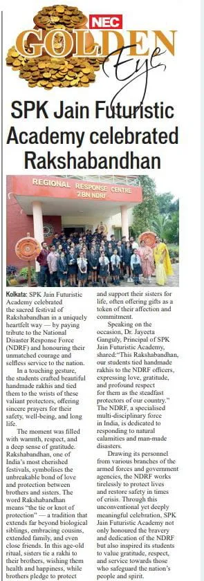 SPK Jain Futuristic Academy, Kolkata, marked Raksha Bandhan with a special tribute to the National Disaster Response Force (NDRF). Students crafted and tied handmade rakhis to these brave protectors, conveying heartfelt gratitude, deep respect, and wishes for their safety.
