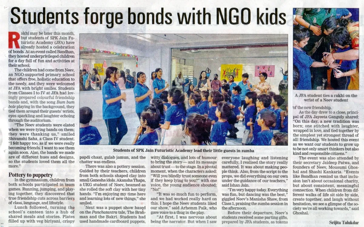 SPK Jain Futuristic Academy recently celebrated Bandhan, an event that brought together JFA students and children from NEEV, an NGO-supported school, for a day of joy, learning, and togetherness.