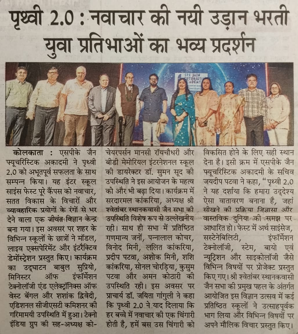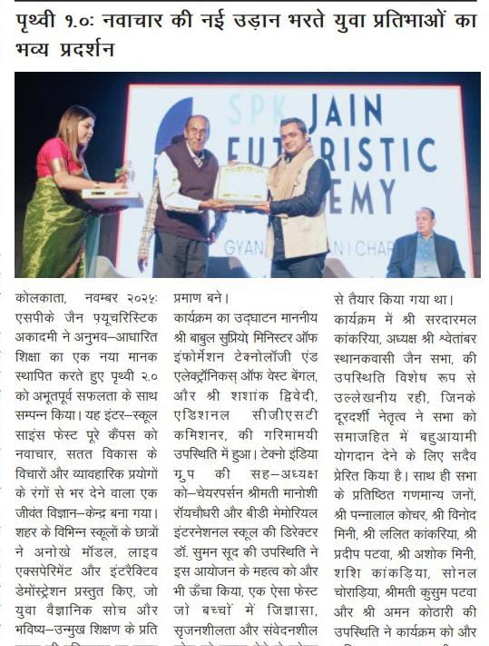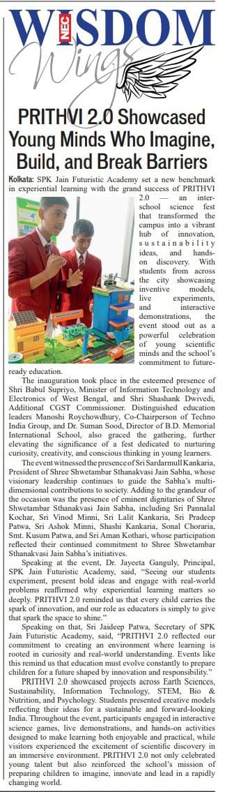 NEWS 2023 2024 Where Every Update Shapes a Brighter Tomorrow Jan Feb mar apr may jun jul aug Sep oct nov dec PRITHVI 2.0 Celebrates Young Innovators at SPK Jain Futuristic Academy 22nd November 2025 https://koushanimedia.com/?p=692 https://srbnewsbangla.in/prithvi-2-0-showcased-young-minds-who-imagine-build-and-break-barriers/ https://theinsightwire.in/prithvi-2-0-celebrates-young-innovators-at-spk-jain-futuristic-academy/ https://banglarkhoborakhobor.com/prithvi-2-0-showcased-young-minds-who-imagine-build-and-break-barriers/