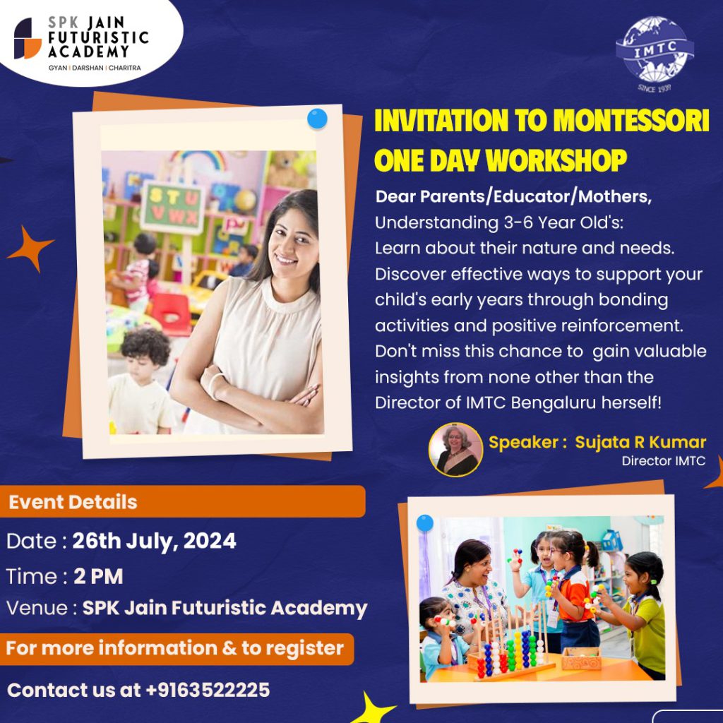 Join us at SPK Jain Futuristic Academy for an insightful session on understanding 3-6 year olds. Learn about their nature and needs, and discover effective ways to support your child’s early years through bonding activities and positive reinforcement. Don’t miss this opportunity to gain valuable insights from Mrs. Sujata R. Kumar, Director of IMTC Bengaluru!