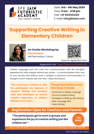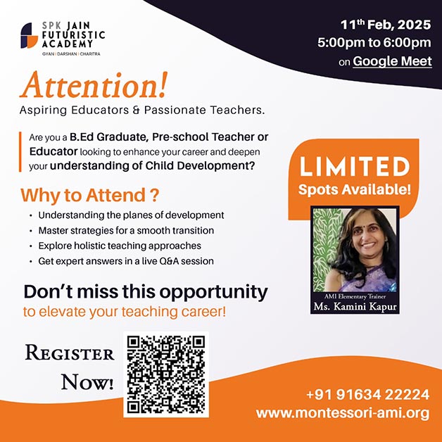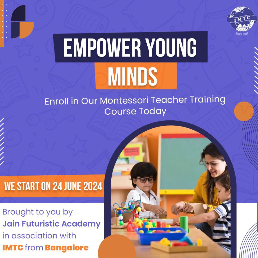 Jain Futuristic Academy is organizing a workshop to enhance teaching quality and deepen educators' knowledge in Child Development. This session, led by Ms. Kamini Kapur (AMI Elementary Trainer), is a must-attend for B.Ed Graduates, Pre-school Teachers, and Educators looking to grow in their careers.
